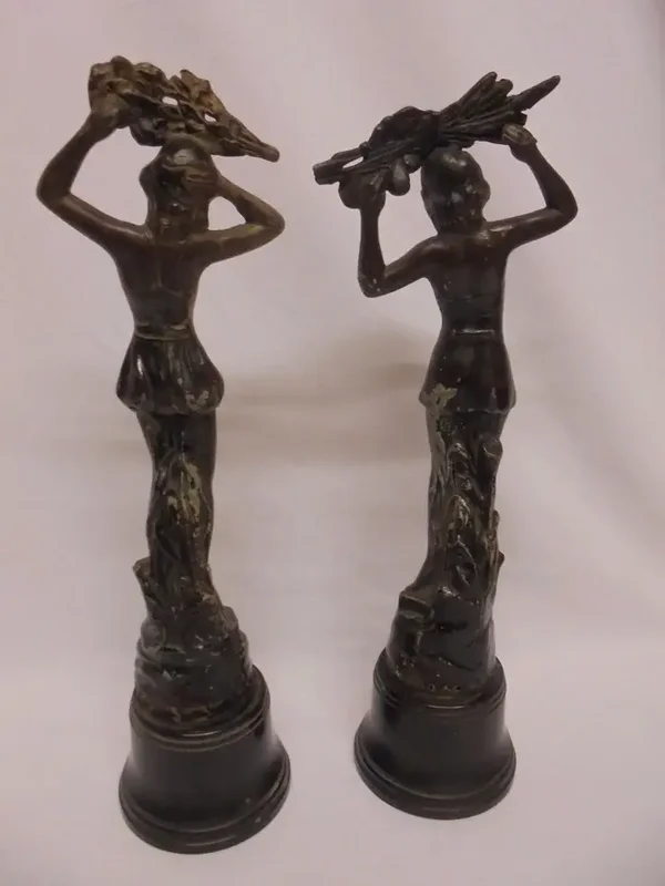 This is a Vintage Pair Of Art Deco Spelter Figures On Brown Bakelite Bases. They measure approximately 33 cm in height and are in shabby vintage condition with plenty of signs of age and use -